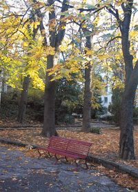 Attraverso un cancello si accede al giardino che si estende attorno ad una serie di vialetti asfaltati che si sviluppano con percorsi curvilinei in leggera salita fino all’area giochi e alle zone di sosta che sono strutturate in modo fantasioso, circondate da siepi sempreverdi e alberi dalle notevoli chiome.